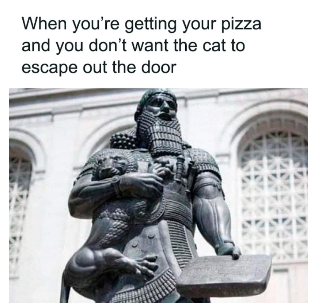 Antique statue of a warrior with a curly beard, holding a lion in one arm and probably a ceramic tablet in the other. There's a caption over the picture: "When you're getting your pizza and you don't want the cat to escape out the door"